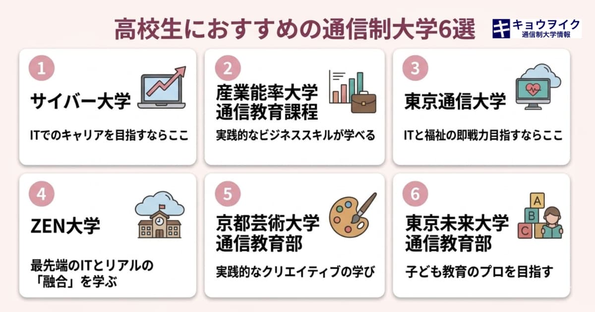 本記事では、高校生に向けた視点で、通信制大学に関する基礎知識やおすすめの通信制大学をご紹介しました。通信制大学は、新しい学び方の1つであり、自分のライフスタイルに合わせて学べるだけでなく、将来の職業選択にも幅広い可能性を提供します。